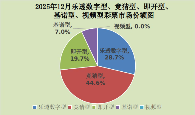 12月份,乐透数字型彩票销售150.19亿元,同比减少16.05亿元,下降9.7%;竞猜型彩票销售233.33亿元,同比减少41.86亿元,下降15.2%;即开型彩票销售103.40亿元,同比增加4.71亿元,增长4.8%;基诺型彩票销售36.58亿元,同比增加1.00亿元,增长2.8%。12月份,乐透数字型、竞猜型、即开型、基诺型彩票销售量分别占彩票销售总量的28.7%、44.6%、19.7%、7.0%。视频型彩票销售0.0046亿元,同比增加0.0034亿元。